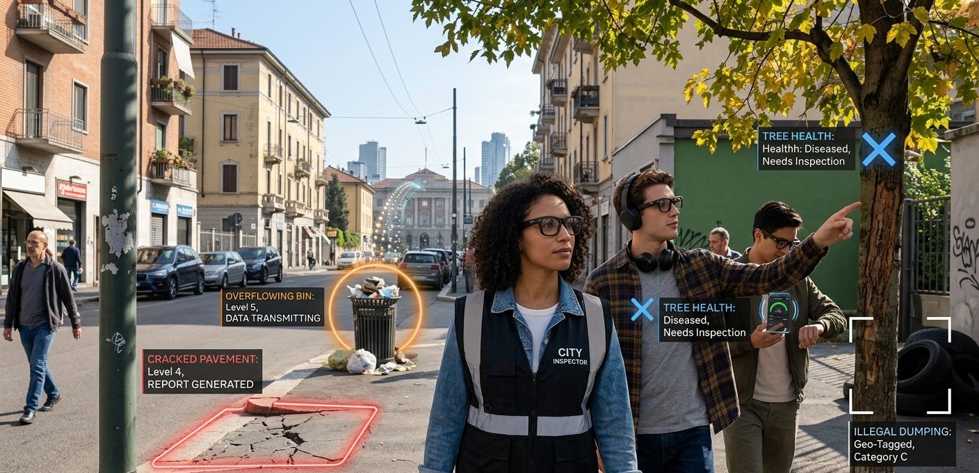 Municipal inspectors or engaged citizens walk their neighborhood wearing Meta glasses. The app identifies urban decay, maintenance issues, and environmental conditions, cracked pavement, overflowing bins, damaged street furniture, illegal dumping, tree health — and automatically generates geo-tagged reports for the relevant municipal department. Civic participation meets ambient intelligence.