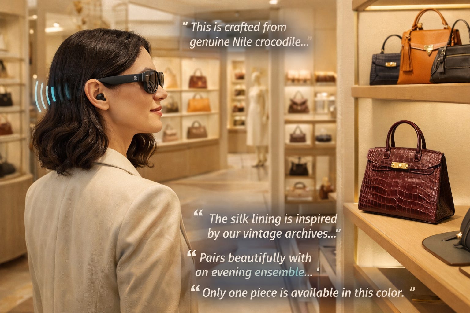 A client enters a Maison wearing Meta glasses (provided by the store). As they browse, the glasses recognize products and a warm, knowledgeable voice provides context: the craftsmanship story, material provenance, styling suggestions, and availability, like having the brand’s most experienced advisor whispering in your ear. No screens, no interruptions, no hovering sales associate.