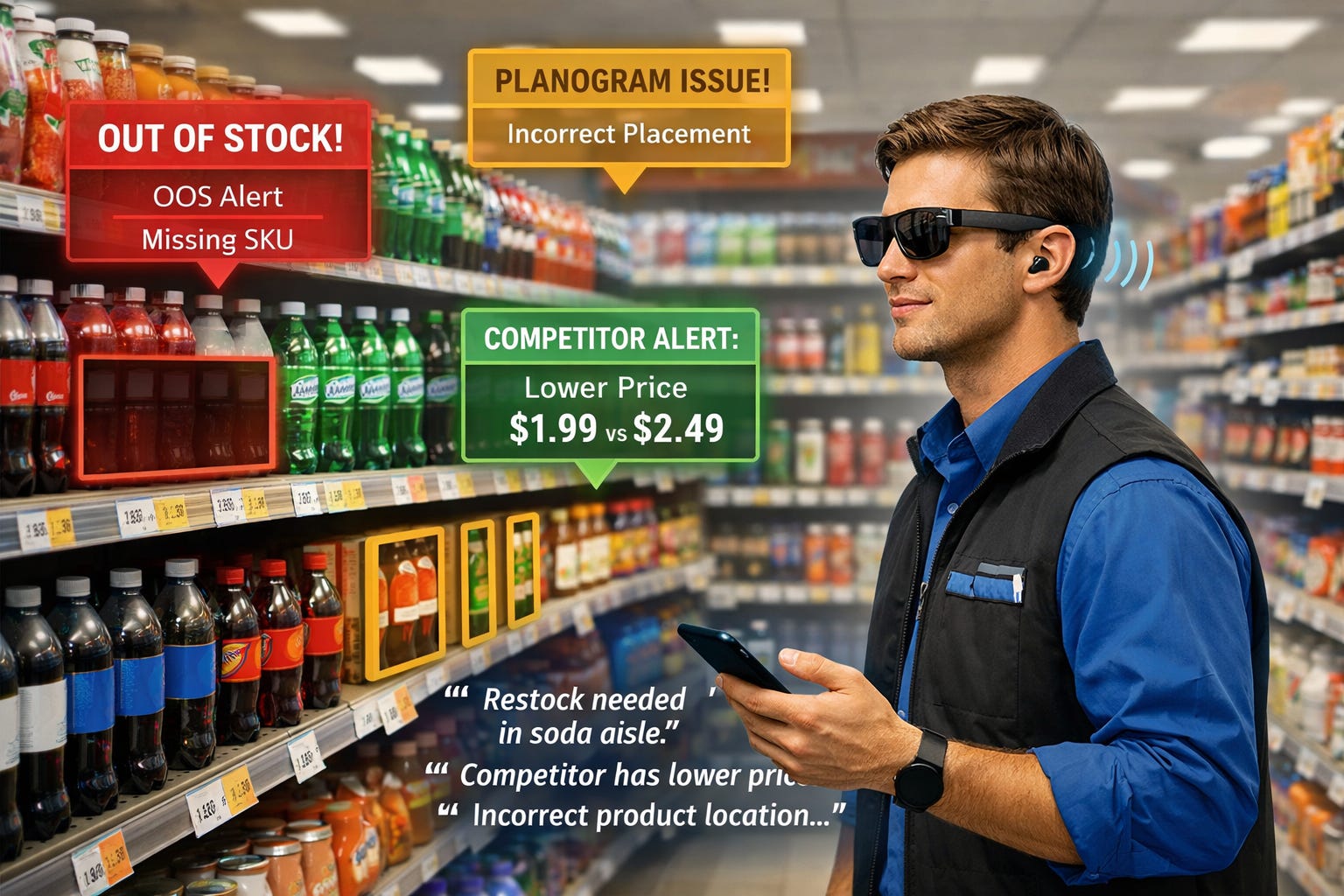 A field rep walks a store aisle wearing Meta glasses. The app continuously captures shelf imagery, identifies products via a multimodal model, and whispers insights through the speakers: out-of-stock SKUs, competitor placements, planogram compliance issues, and pricing discrepancies, all hands-free while the rep continues working.